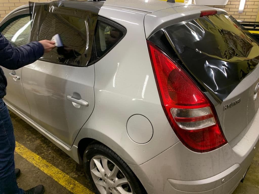 Первое - пленка клеиться изнутри автомобиля, но раскройка и формовка уже делается снаружи. Заключительная оклейка происходит на внутренней части стекла авто.